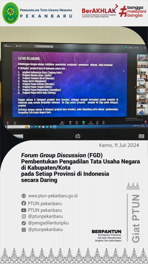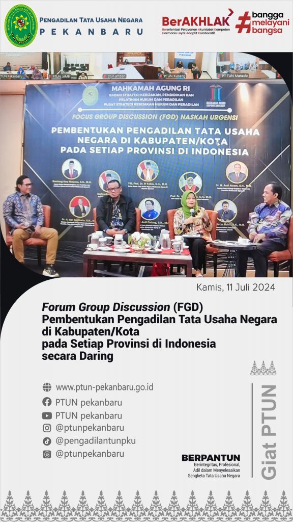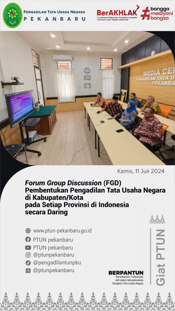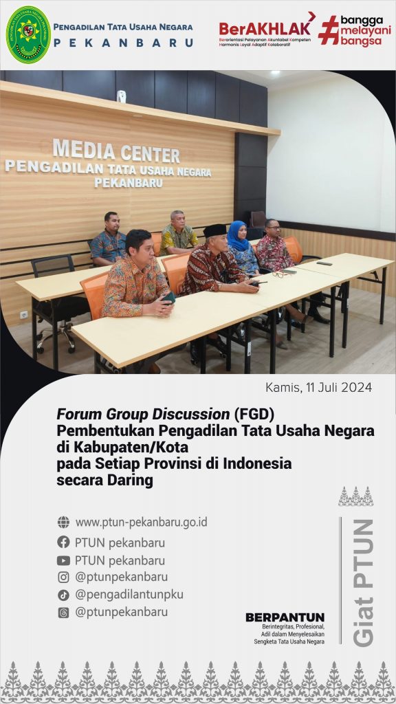 July 16, 2024Pekanbaru: Ketua PTUN Pekanbaru (Bapak Hariyanto Sulistyo Wibowo, S.H.) didampingi oleh Hakim PUN Pekanbaru mengikuti Forum Group Discussion (FGD) dengan pembahasan mengenai Pembentukan Pengadilan Tata Usaha Negara di Kabupaten/Kota pada setiap Provinsi di Indonesia secara Daring. Kegiatan ini dilaksanakan pada hari Kamis, 11 Juli 2024, bertempat di Ruang Media Center PTUN Pekanbaru.