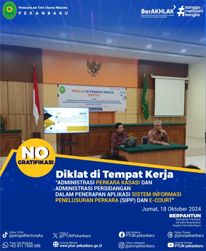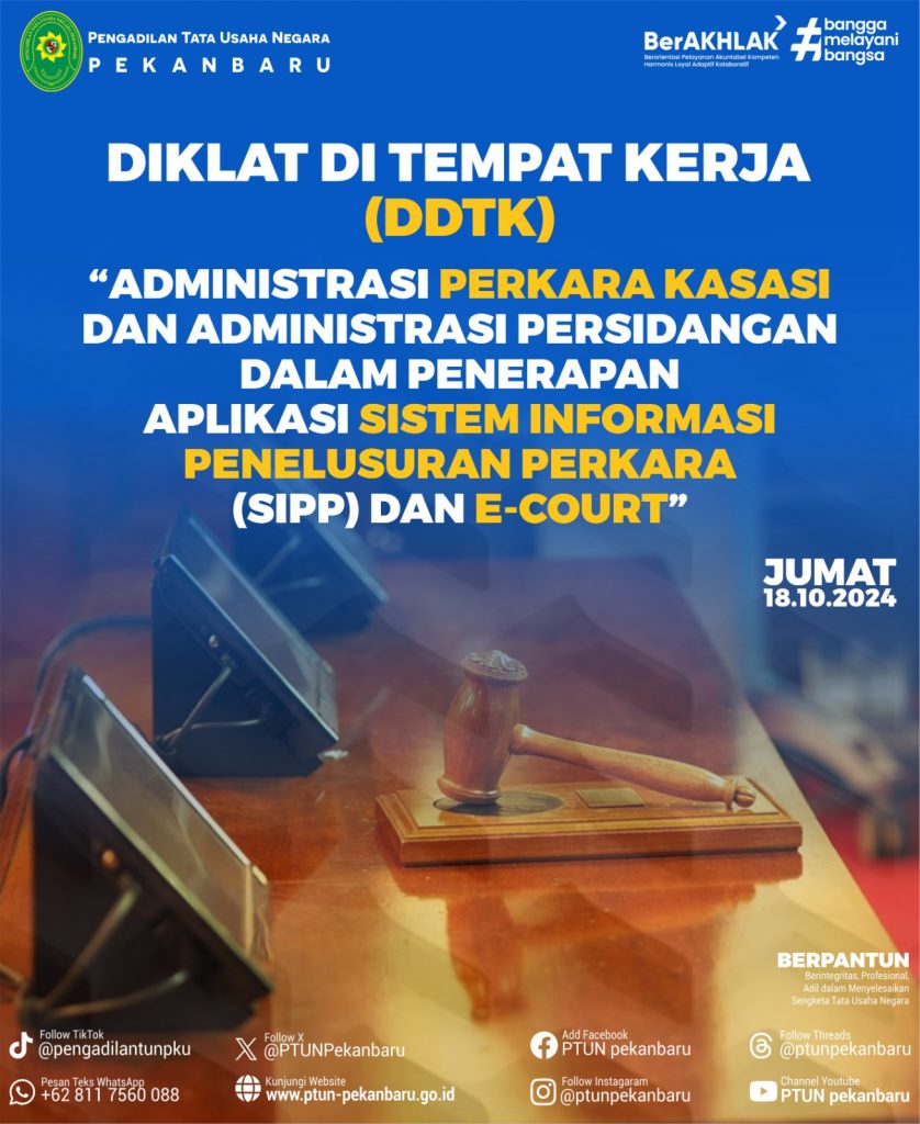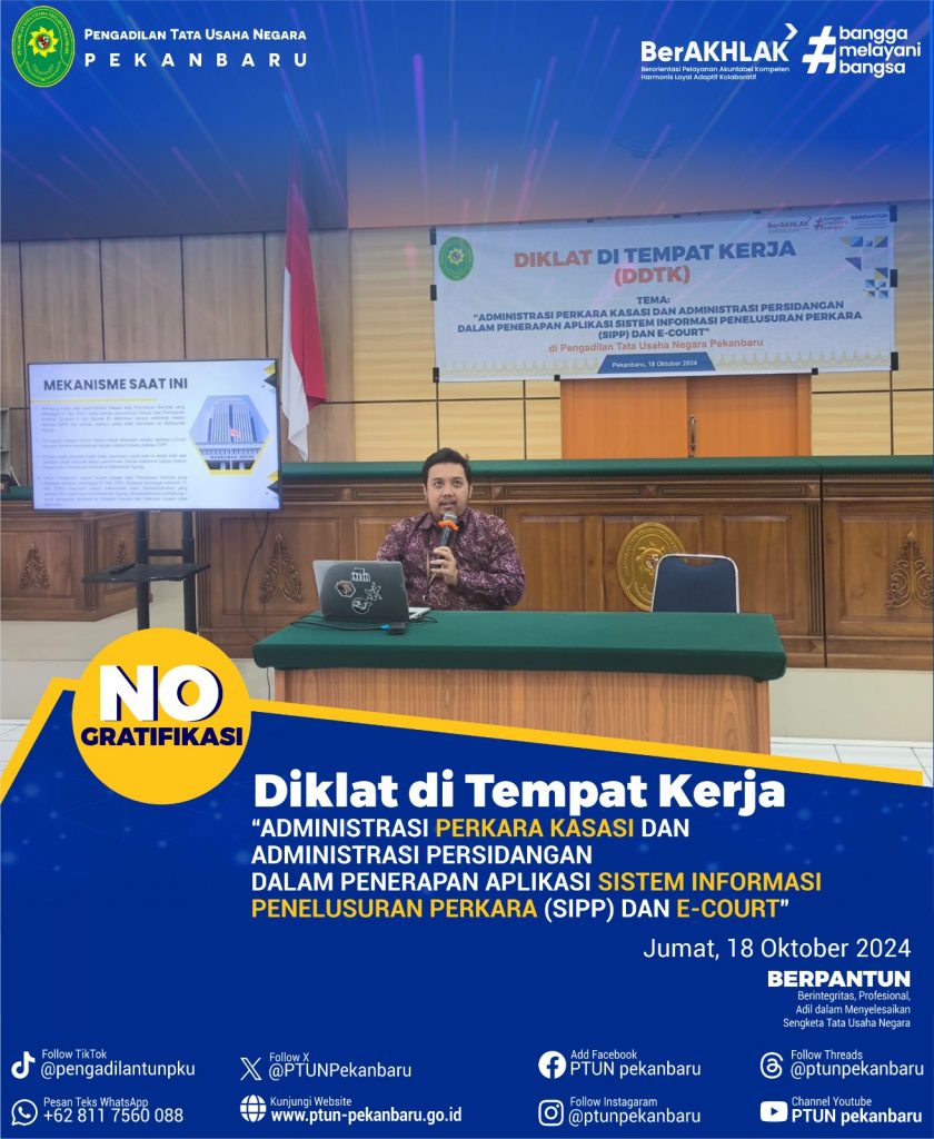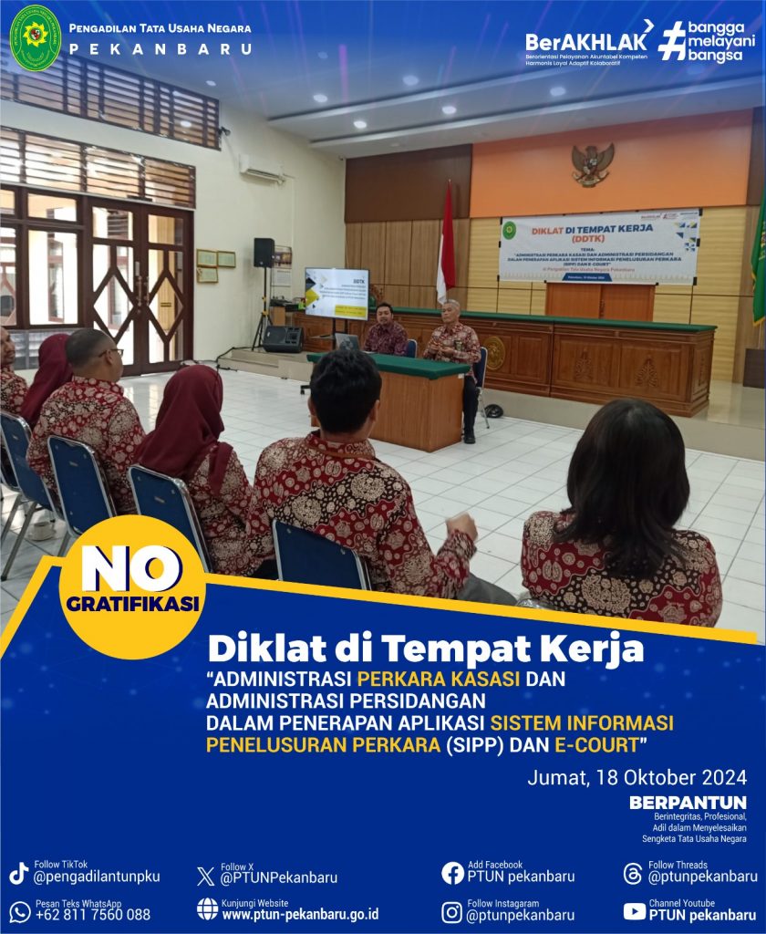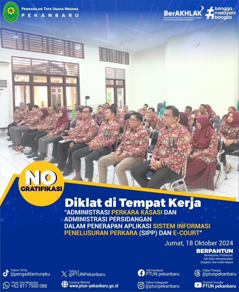 Pekanbaru Pada hari Jumat, 18 Oktober 2024, bertempat di ruang Sidang Utama, telah dilaksanakan Diklat dengan tema “Administrasi Perkara Kasasi dan Administrasi Persidangan dalam Penerapan Aplikasi Sistem Informasi Penelusuran Perkara (SIPP) dan E-Court”.