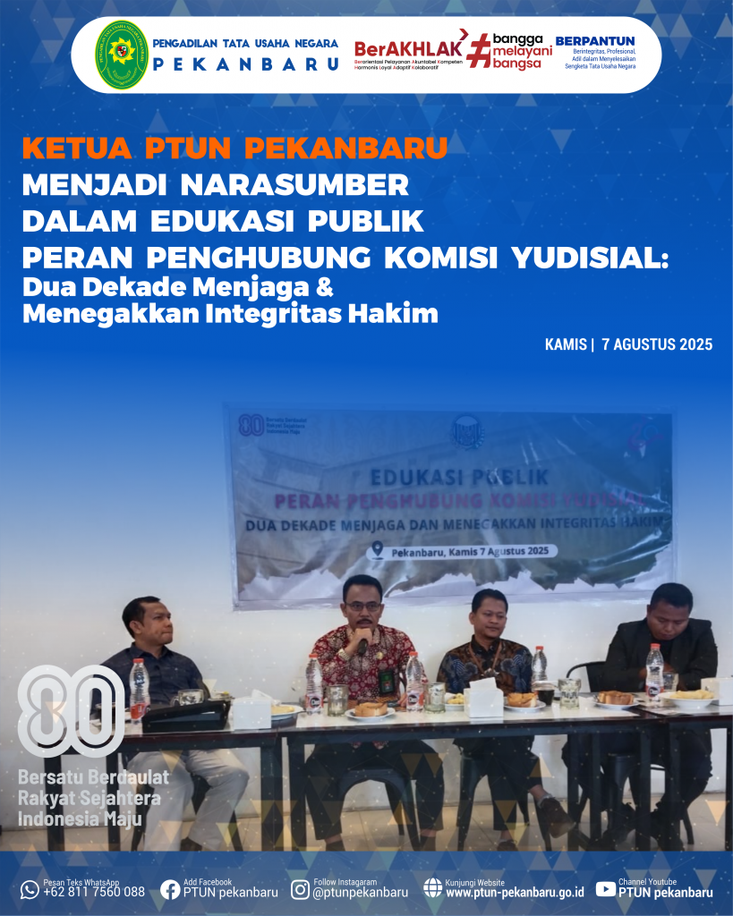 Ketua Pengadilan Tata Usaha Negara Pekanbaru, Bapak Effendi, S.H., menjadi narasumber dalam kegiatan edukasi publik bertajuk “Peran Penghubung Komisi Yudisial: Dua Dekade Menjaga dan Menegakkan Integritas Hakim” pada Kamis, 7 Agustus 2025.