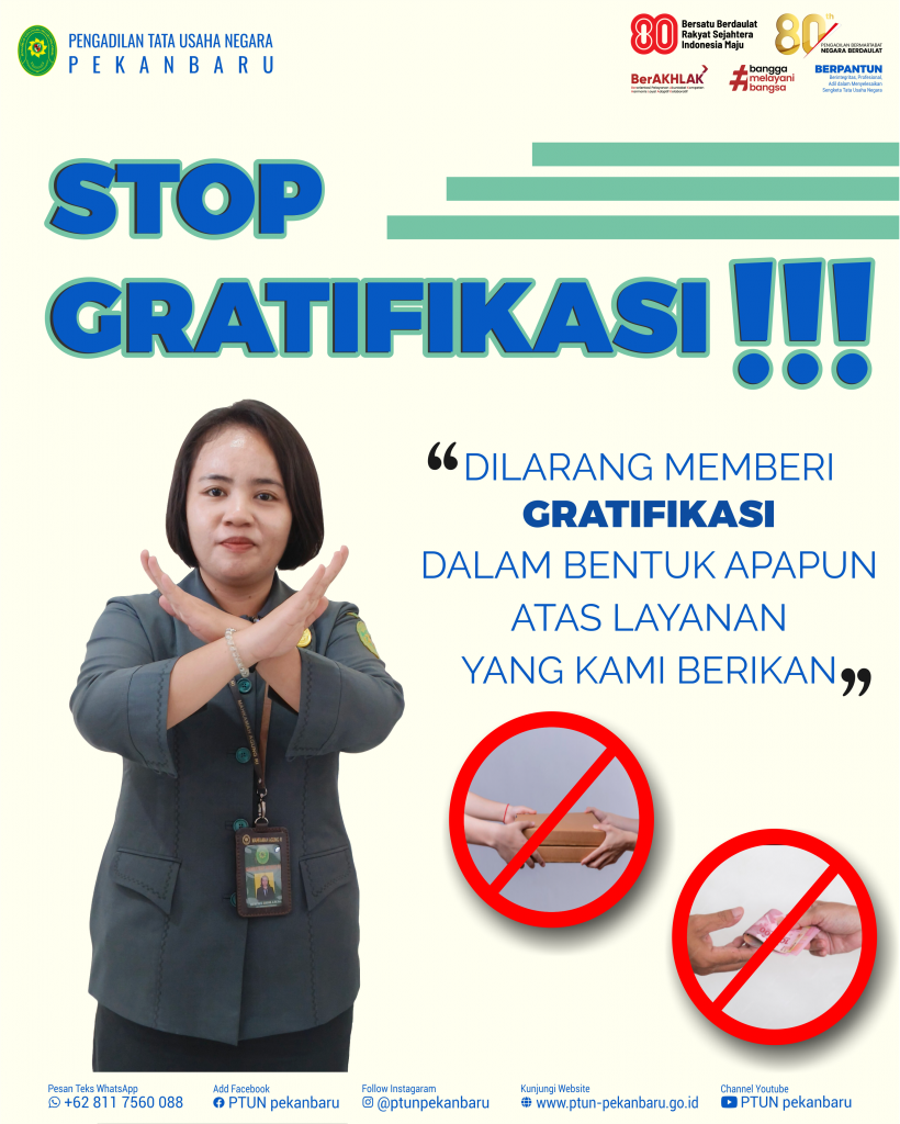 Pengadilan Tata Usaha Negara Pekanbaru berkomitmen penuh dalam mewujudkan pelayanan yang bersih, transparan, dan bebas dari praktik Korupsi, Kolusi, dan Nepotisme (KKN). Sejalan dengan semangat tersebut, setiap bentuk gratifikasi dalam bentuk apapun dilarang diberikan maupun diterima terkait dengan layanan yang kami sediakan.
